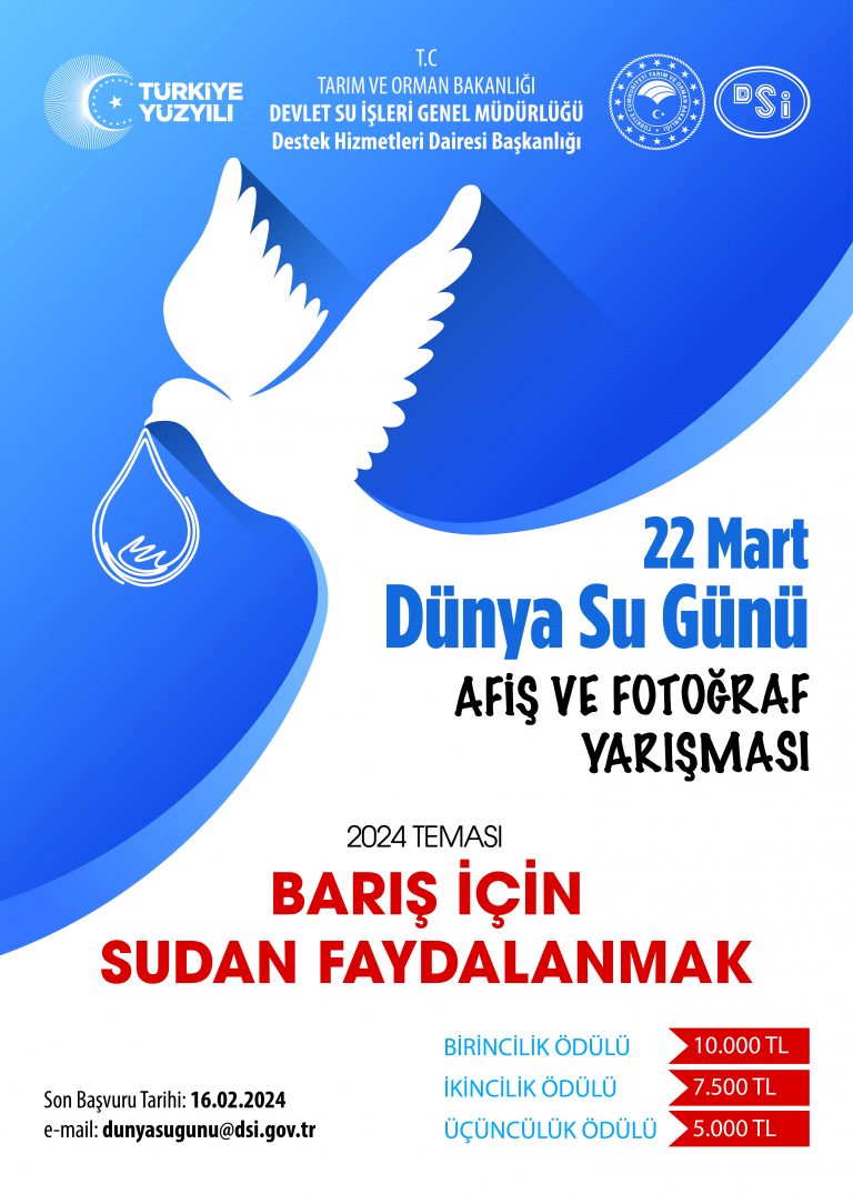 Tarım ve Orman Bakanlığı Devlet Su İşleri Genel Müdürlüğü 9. Bölge Müdürlüğünün, 22 Mart Dünya Su Günü etkinlikleri kapsamında UNCED tarafından belirlenen "Barış İçin Sudan Faydalanmak" temalı afiş ve fotoğraf yarışması düzenlenecektir.