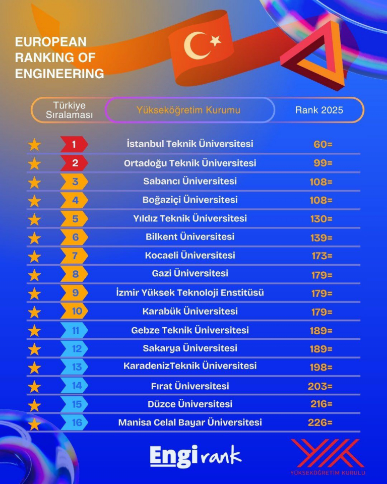 Üniversitemiz, Avrupa’nın prestijli mühendislik sıralamalarından EngiRank 2025 sonuçlarında 203. sıraya yerleşerek önemli bir uluslararası başarıya imza attı. Üniversitemiz Türkiye’deki üniversiteler arasında ise 14. oldu.