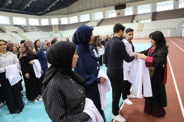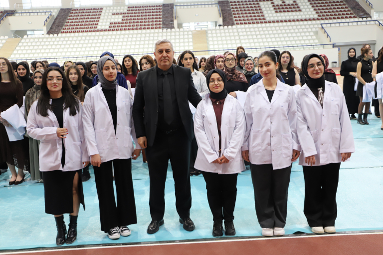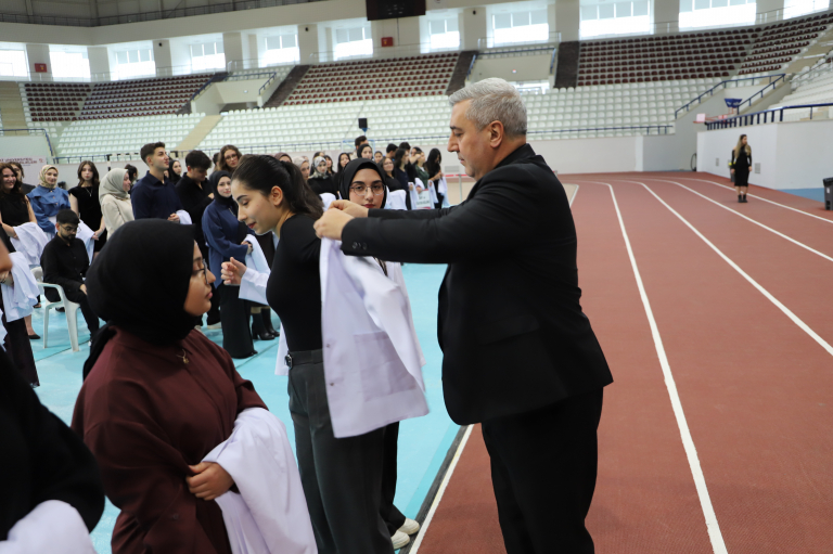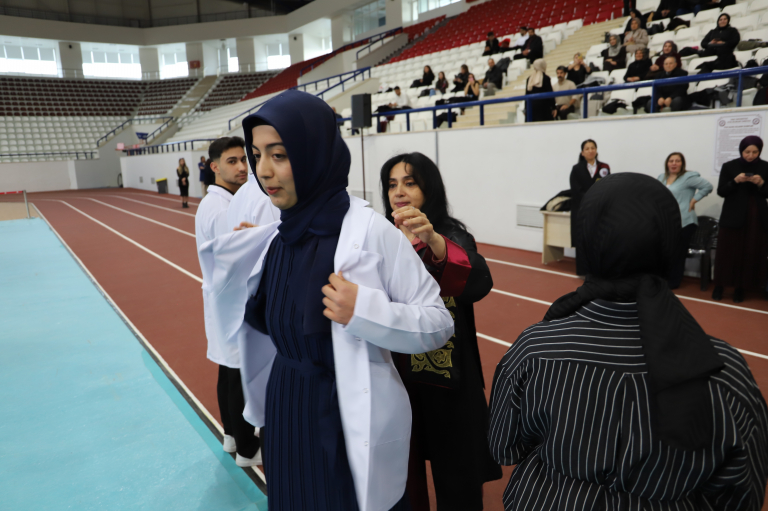 Konuşmaların ardından öğrenciler sahneye davet edilerek beyaz önlüklerini giydi. Meslek yemini niteliği taşıyan bu anlamlı anlar, öğrenciler ve aileleri tarafından alkışlarla karşılandı.