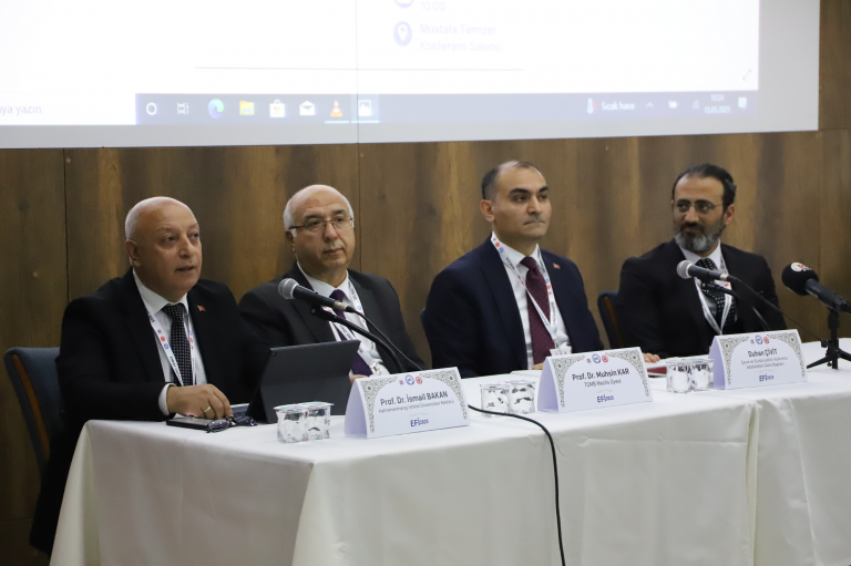 EFİ 2025 Küresel Ekonomide Yeni Dengeler ve Sürdürülebilir Gelecek konusu alt başlığında Üniversitemizin ev sahipliğinde düzenlenen kongreye konuşmacı olarak katılan, Kahramanmaraş İstiklal Üniversitesi Rektörü Prof. Dr. İsmail Bakan, TC Merkez Bankası Meclisi Üyesi, Prof. Dr. Muhsin Kar ile Çevre ve Sürdürülebilir Kalkınma İstatistikleri Daire Başkanı Duhan Çivit kongreye katılanlara ekonomi, finans ve işletme alanlarındaki tüm teorik ve ampirik araştırmalarla ilgili çeşitli bilgiler sundular.