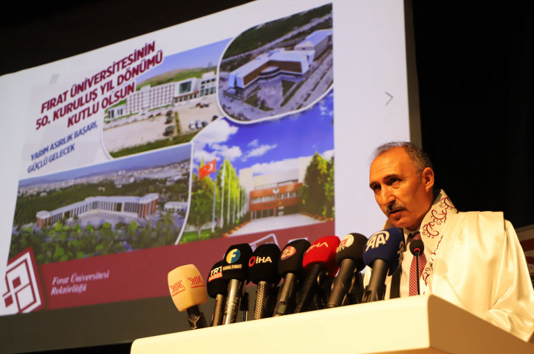 Fırat Üniversitesinin 50. Yıl dönümünü tebrik eden YÖK Başkanı Prof. Dr. Erol Özvar, “Bu anlamlı 50. yıl dönümünde, siz değerli akademisyenlerimize, idari personelimize ve öğrencilerimize başarılar diliyorum. Kıymetli rektörümüz Prof. Dr. Fahrettin Göktaş’a misafirperverlikleri için teşekkür ediyorum. Daha önce görev yapmış olan rektör hocalarımız da büyüklerimizi de davet edilmiş. Buradan onlara da saygılarımı ve sevgilerimi sunuyorum. Yaptıkları katkıları ortaya koydukları emeği ve çabaları için her birilerine, her bir hocamıza şükranlarımızı buradan sunuyoruz. Vefat etmiş öğretim elemanlarımıza ve idarecilerimize Allah'tan rahmet diliyoruz. Geride kalanlara sağlık afiyet diliyoruz. Üniversitemizin bu noktaya gelmesi için emeği geçen bütün idarecilerimizi saygıyla anıyorum. Katkıda bulunan bütün öğretim elemanlarımıza buradan ayrı ayrı selam ediyorum. Hepinizi bu vesileyle tekrardan saygı ve sevgiyle selamlıyorum. Daha nice elli yıllara diyerek hepinize saygılarımı sunuyorum. Hepiniz sağ olun. Var olun arkadaşlar. Teşekkür ederim. Bu vesileyle bir teşekkürümü en son teşekkürümü de Fahrettin hocamıza yapıyorum. Sayın Rektörümüz bu güzel organizasyonu gerçekleştirdi. Kendisine hem de ekibine ayrı ayrı teşekkür ediyorum. Başarılarının devamını diliyorum” şeklinde konuştu.